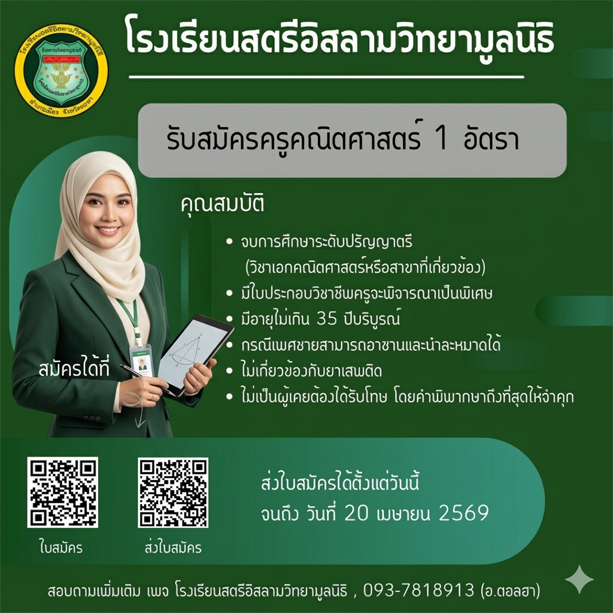 ประกาศรับสมัครครูชีววิทยา จำนวน 1 อัตรา วันที่ 19 - 23 พฤศจิกายน 2568 เวลา 09.00 - 15.30 น. ณห้องฝ่ายบุคลากร