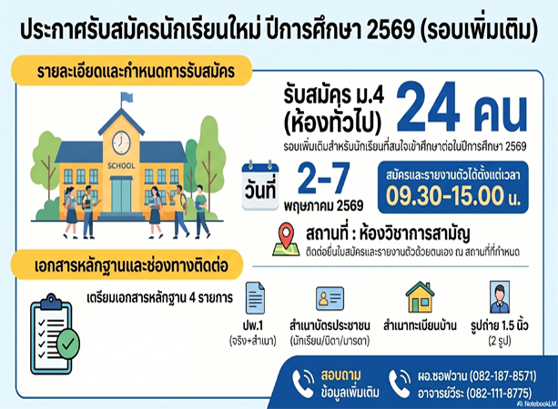 ประกาศรับสมัครนักเรียนใหม่ห้องเรียนทั่วไป ปีการศึกษา 2569 (รอบสอง) วันที่ 8 ธันวาคม 2568 เป็นต้นไป ณ อาคารส้ม และระบบออนไลน
